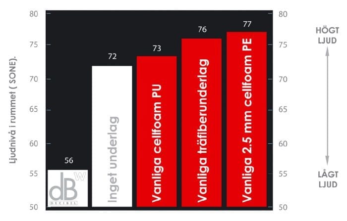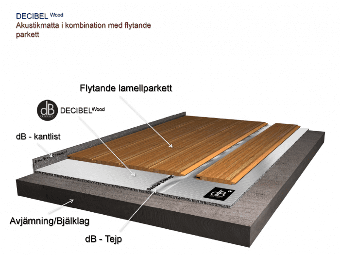 Decibel Wood erbjuder en likvärdig gummistruktur som dB2 fast med en lägre bygghöjd och något begränsad akustiskt sett, men då bara i jämförelse med vår dB2. Decibel Wood erbjuder fortfarande mycket goda egenskaper som förbättrar stegljudsisolering, trumljudsisolering och parkettresonans.